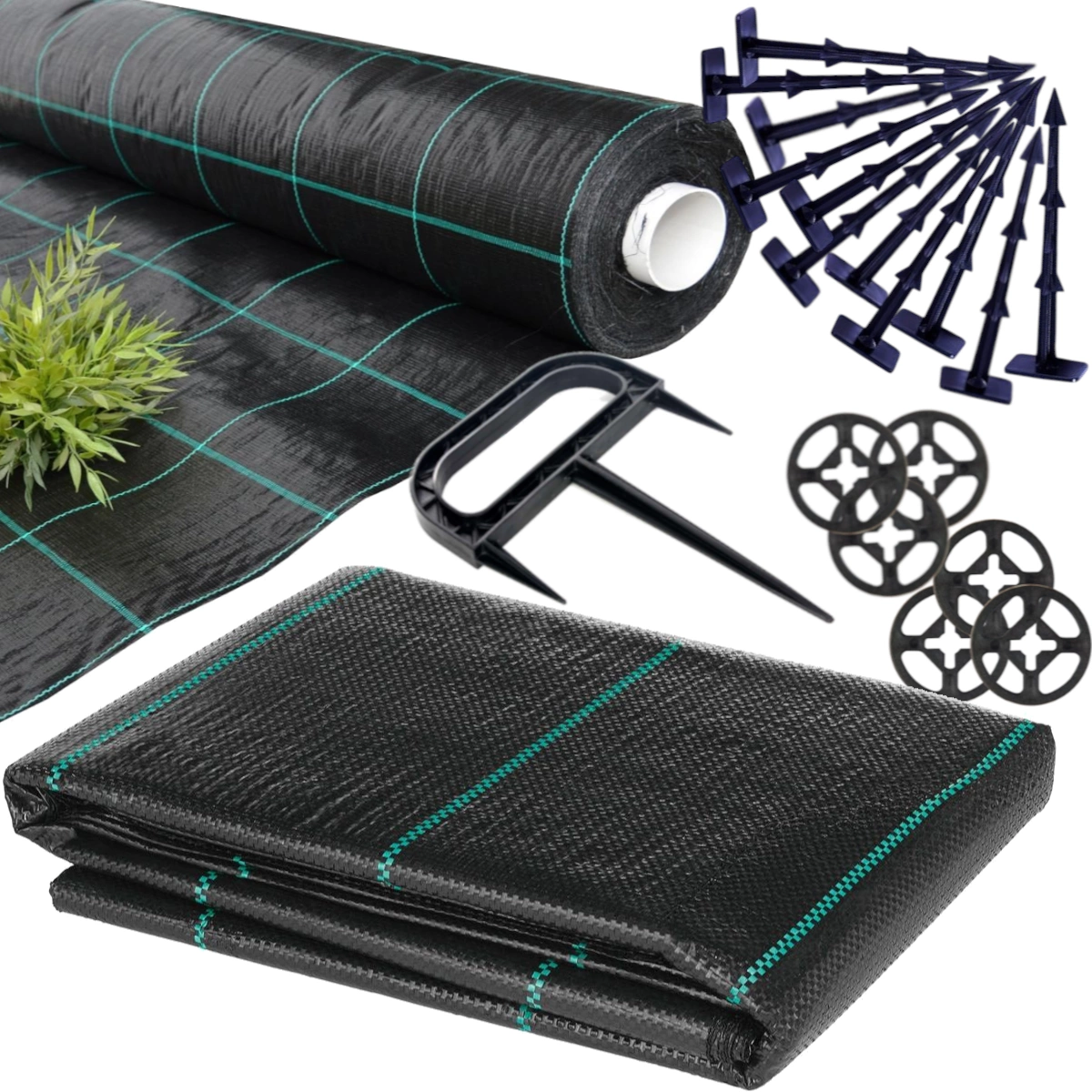 Zestaw: Agrotkanina 100 g/m² 1,6 × 20 m + Kotwy 150mm 200 szt. + Kotwa wielokrotnego użytku + Podkładki dociskające – Kompletny Zestaw do Ściółkowania