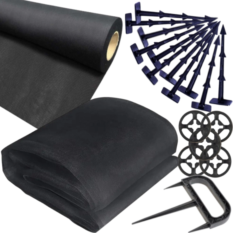 Zestaw: Agrowłóknina 100g 1,6 × 20 m + Kotwy 150mm 200 szt. + Kotwa wielokrotnego użytku + Podkładki dociskające – Kompletny Zestaw do Ściółkowania