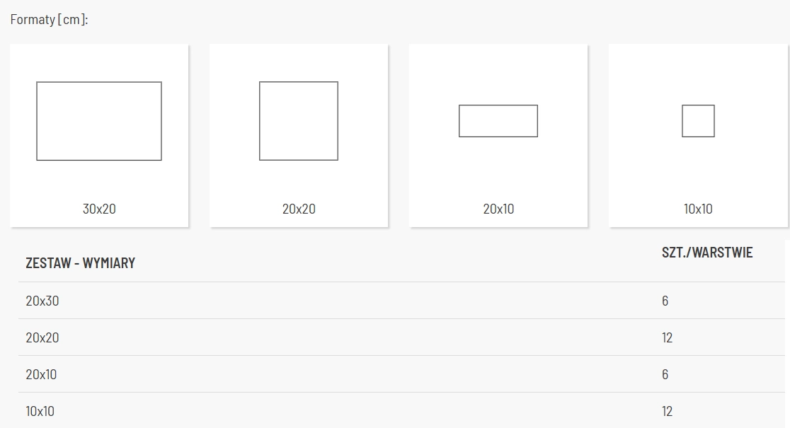 - Wymiary elementów: 30x20cm / 20x20cm / 20x10cm / 10x10cm