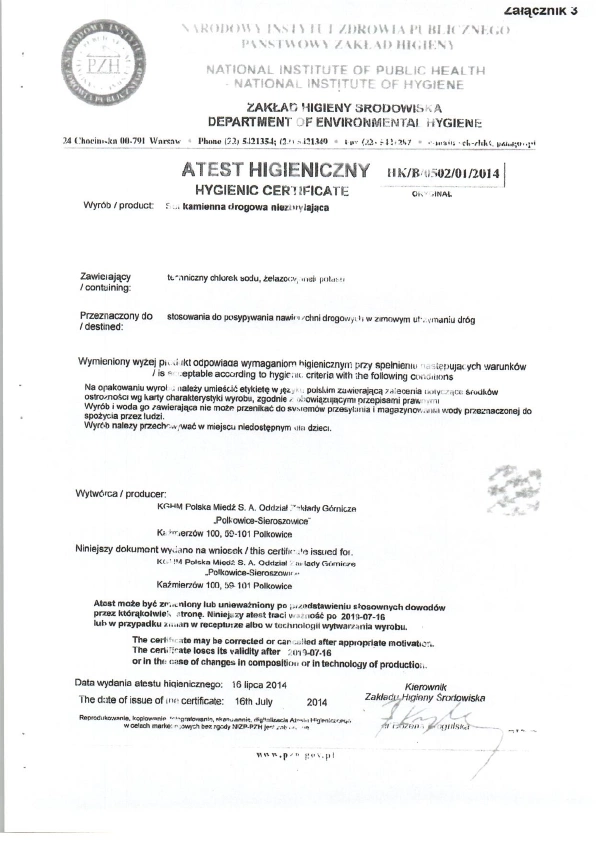 1. Pytanie: Czy sól drogowa posiada deklarację zgodności z normą?